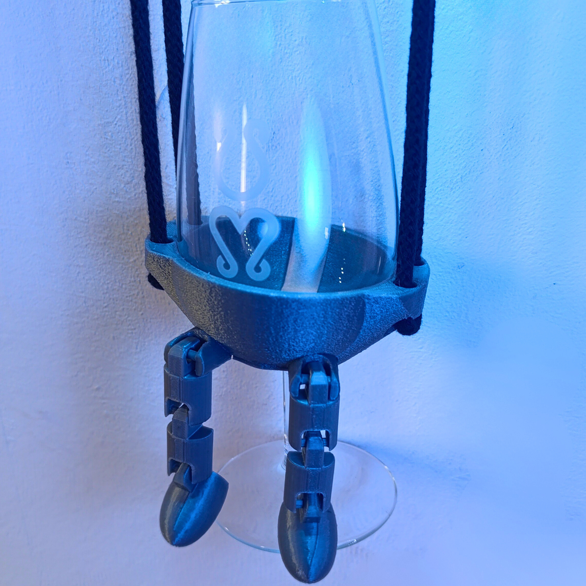Das Glas wird einfach in die halbrunde Halterung eingehängt und sitzt stabil, ohne herauszufallen. Der Halter ist leicht, robust und im 3D-Druck gefertigt. Zwei flexible, nach vorne hängende Beine geben dem Design einzigartige, lustige Note.